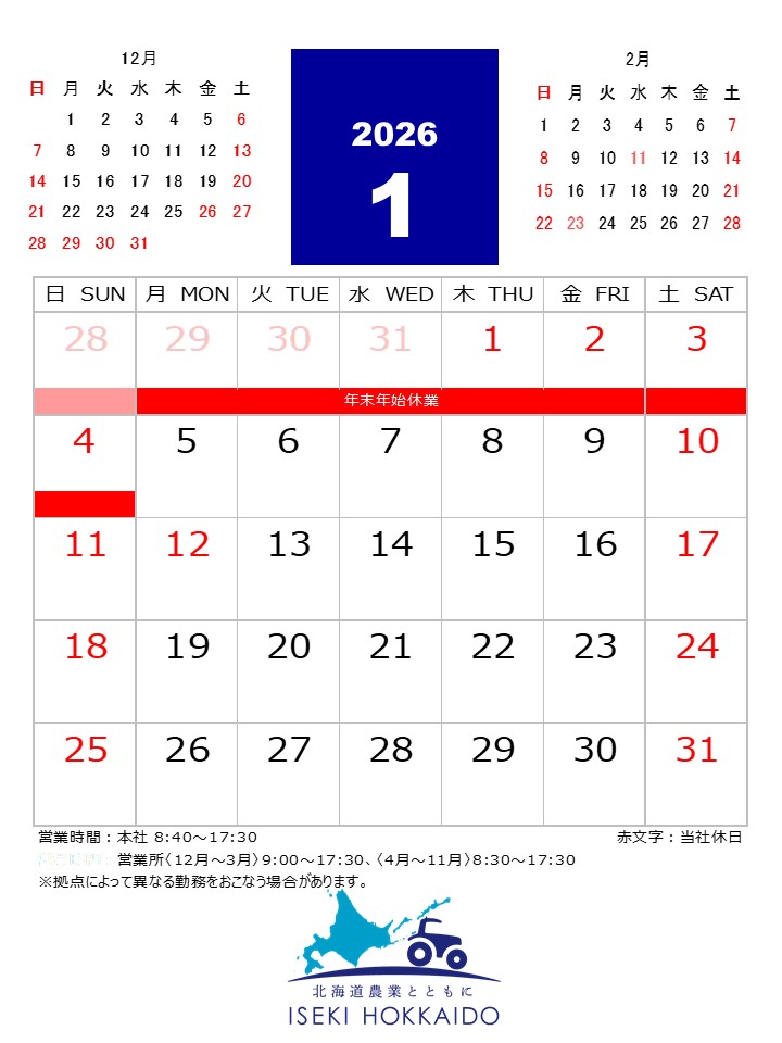北海道カンパニー 北海道カンパニートップ 商品情報 会社概要 採用情報 販売店情報 お知らせ イベント お問い合わせ 株式会社ISEKI Japan2026年1月営業日カレンダー お知らせ 2026年01月05日 2026年1月営業日カレンダー ◆地域性や会社業務都合により、拠点によっては異なる勤務を行う場合があります。 ◆詳しくは、最寄りの各営業所までお問い合わせご確認ください。